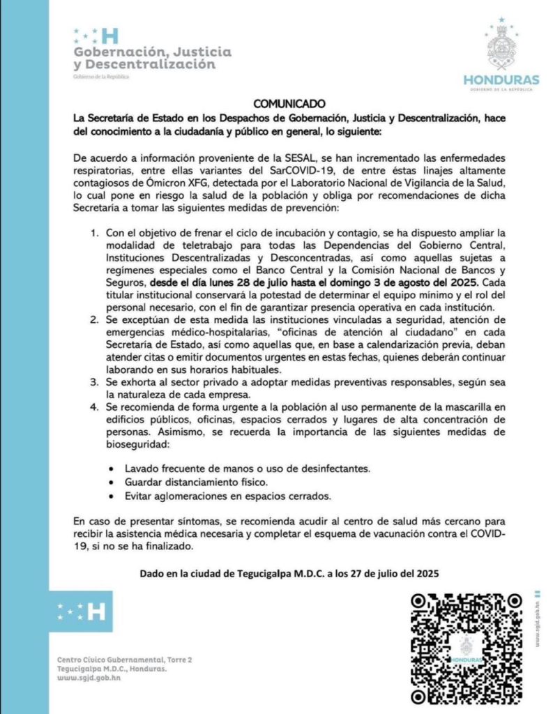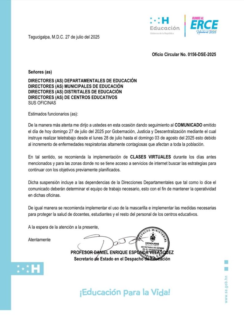 La Secretaría de Educación instruyó que esta semana del 28 de julio al 3 de agosto se trabajará bajo la modalidad de teletrabajo y clases virtuales en el sistema educativo. La medida, dirigida a autoridades y centros escolares, busca prevenir contagios ante el aumento de enfermedades respiratorias en el país.