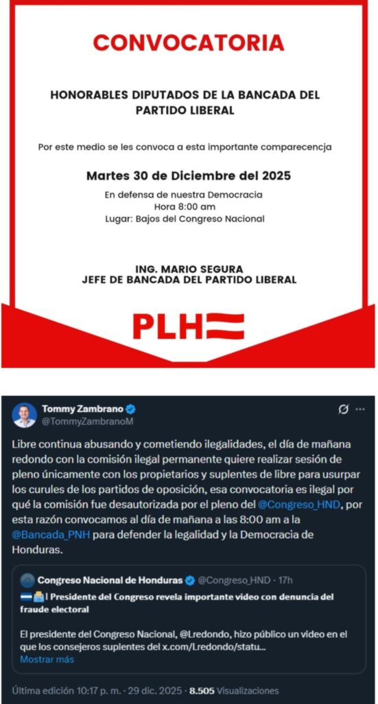 Tegucigalpa.- Ante lo que califican como presuntos intentos de anular los resultados electorales por parte del Partido Libre y del presidente del Congreso Nacional, Luis Redondo, las bancadas de oposición se presentaron en el hemiciclo legislativo con el objetivo de impedir cualquier acción en ese sentido y garantizar el respeto al proceso electoral.