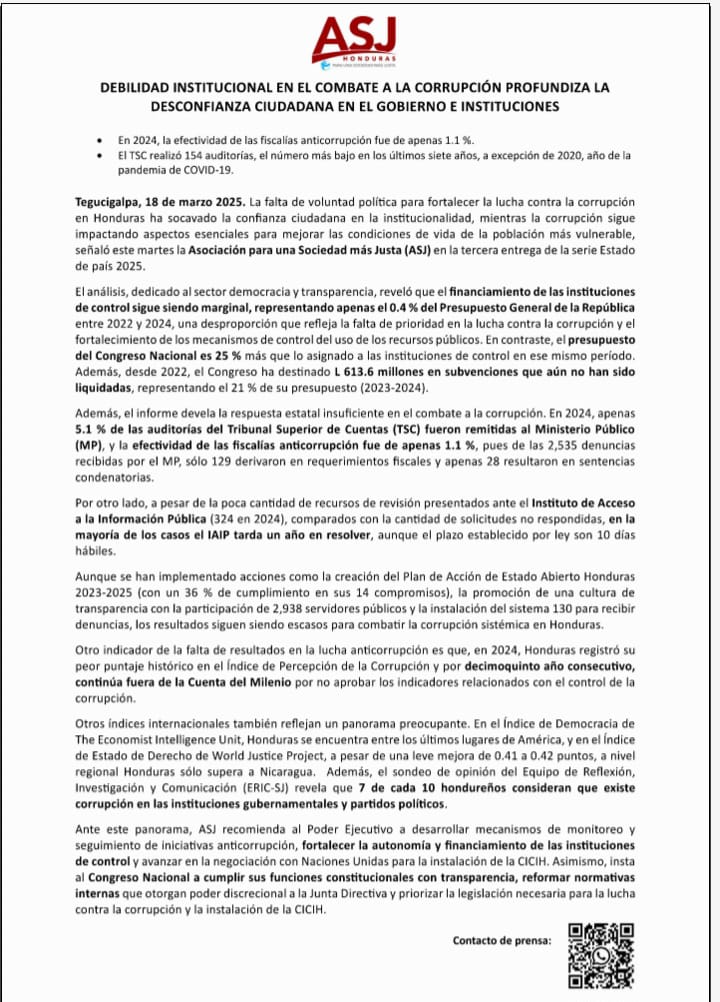 Ante este panorama, la ASJ instó al gobierno a fortalecer los mecanismos de control, garantizar mayor financiamiento a las instituciones de transparencia y priorizar la instalación de la Comisión Internacional contra la Corrupción e Impunidad en Honduras (CICIH).