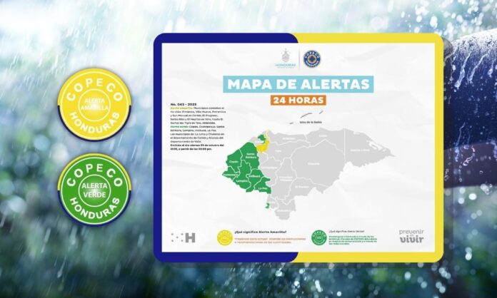 Asimismo, se extiende la Alerta Verde para Copán, Ocotepeque, Santa Bárbara, Lempira, Intibucá, La Paz y los municipios de La Lima y Choloma en el departamento de Cortés, así como Alianza en el departamento de Valle, por un período de 24 horas a partir de las 2:00 p. m. del viernes 3 de octubre de 2025.