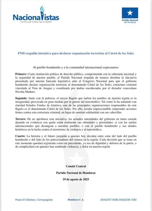 Tegucigalpa.- El Partido Nacional de Honduras (PNH) respaldó de manera absoluta la iniciativa presentada por su bancada en el Congreso Nacional para que el gobierno declare como organización terrorista al denominado Cártel de los Soles, estructura criminal vinculada al Tren de Aragua y, según el comunicado, coordinada por “mafias encabezadas por el dictador venezolano Nicolás Maduro”.