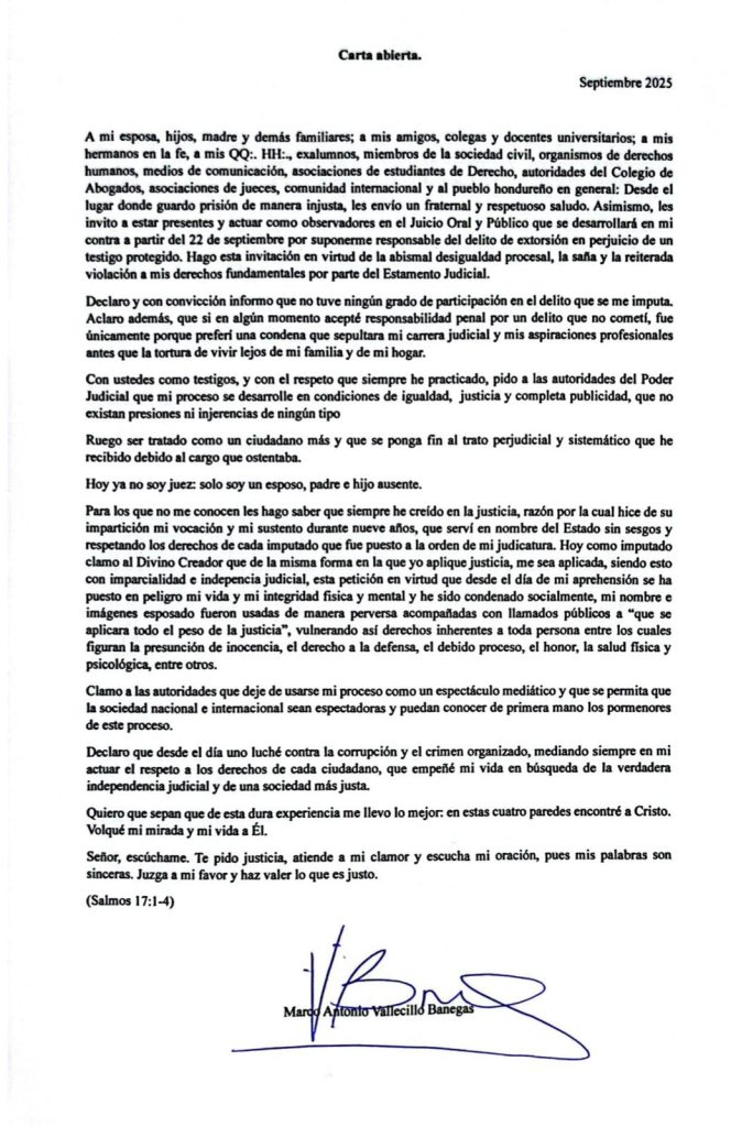 Tegucigalpa.- El exjuez, Marco Vallecillo a través de una carta abierta pidió a familiares, amigos, colegas y sociedad civil en general, que lo acompañen a estar presentes y actuar como observadores del juicio oral y público que se desarrollará en su contra a partir del próximo 22 de septiembre.