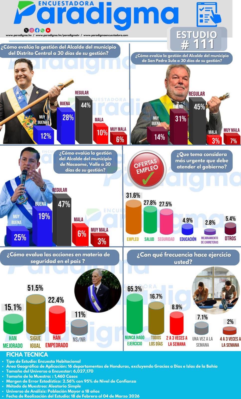 La encuestadora Paradigma presentó los resultados de su Estudio #111, en el que se analiza la percepción ciudadana sobre la gestión de varios alcaldes a 30 días de haber asumido sus cargos, así como las principales preocupaciones de la población hondureña.