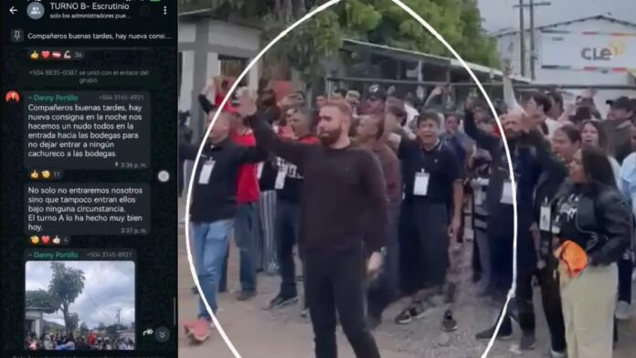 Minutos después, Danny Portillo escribió un mensaje operativo en el chat: convocó a realizar un “nudo” humano en la entrada hacia las bodegas para impedir el ingreso de militantes del Partido Nacional, afirmando que “bajo ninguna circunstancia” se permitiría el acceso.