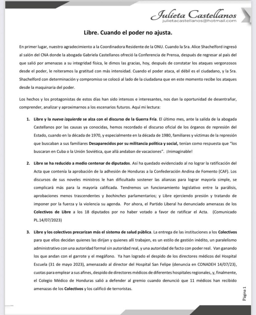 Tegucigalpa.- La exrectora de la Universidad Nacional Autónoma de Honduras (UNAH), Julieta Castellanos, hizo publica este lunes una carta pública denominada «Libre. Cuando el poder no ajusta.» en la que realiza una serie de cuestionamientos y señalamientos al Gobierno de la República y al coordinador del Partido Libre, Manuel Zelaya.