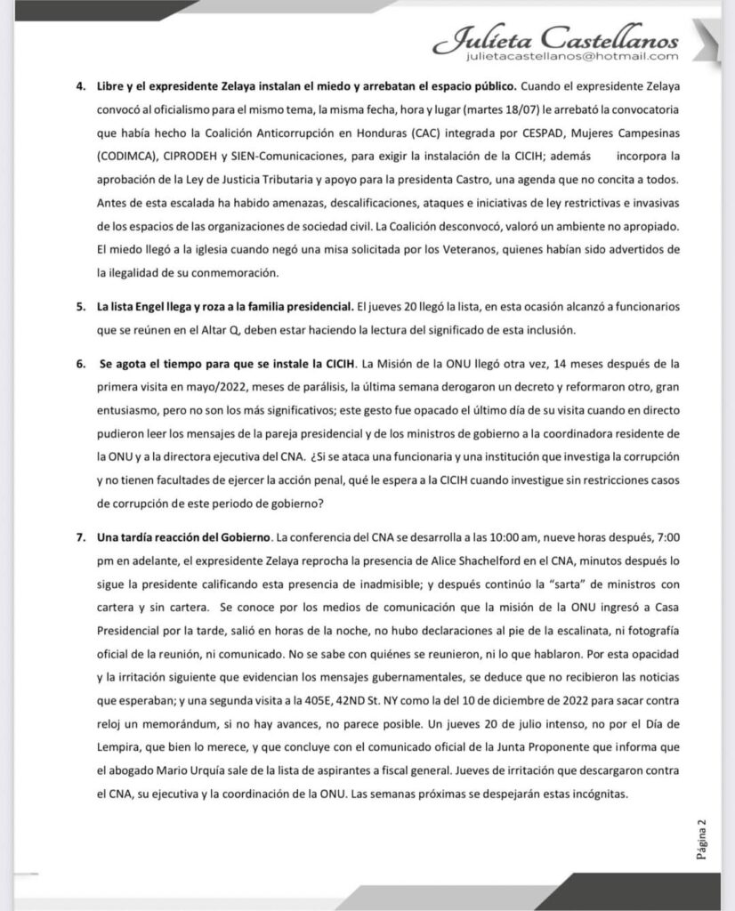 6. Se agota el tiempo para que se instale la CICIH. La Misión de la ONU llegó otra vez, 14 meses después de la primera visita en mayo/2022, meses de parálisis, la última semana derogaron un decreto y reformaron otro, gran entusiasmo, pero no son los más significativos; este gesto fue opacado el último día de su visita cuando en directo pudieron leer los mensajes de la pareja presidencial y de los ministros de gobierno a la coordinadora residente de la ONU y a la directora ejecutiva del CNA. ¿Si se ataca una funcionaria y una institución que investiga la corrupción y no tienen facultades de ejercer la acción penal, qué le espera a la CICIH cuando investigue sin restricciones casos de corrupción de este periodo de gobierno?