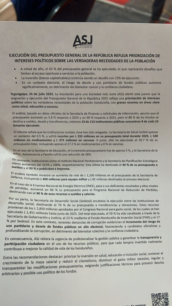 Tegucigalpa.- Asociación para una Sociedad Más Justa (ASJ), condena que la adjudicación y ejecución del Presupuesto General 2025, sea para priorizar intereses políticos y no las verdaderas necesidades de la población hondureña, con graves recortes en áreas clave como salud, educación y vacunas.