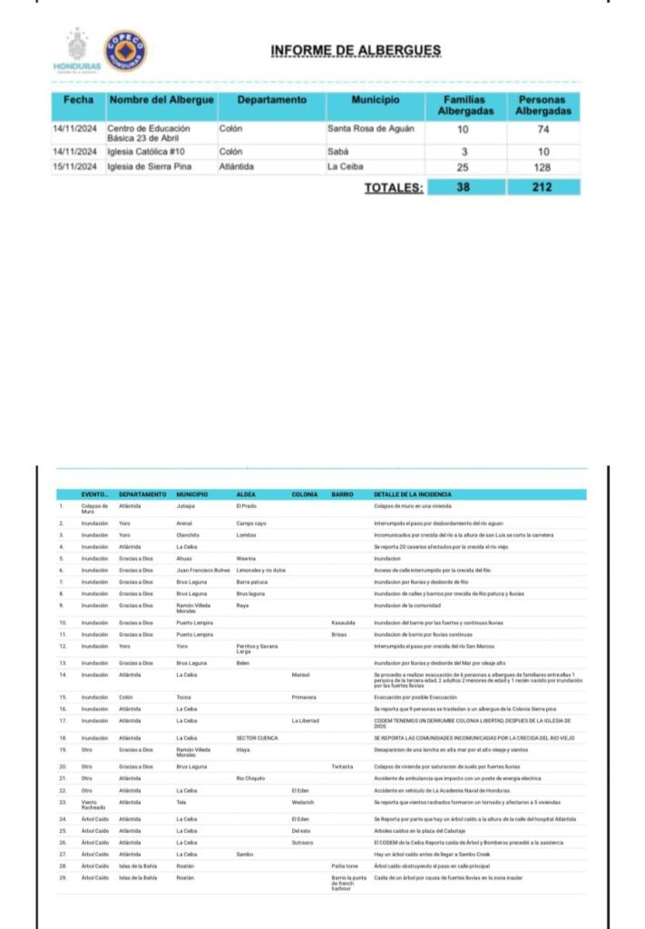 Tegucigalpa.- La Comisión Permanente de Contingencias (Copeco) ha informado este viernes sobre la cantidad de personas afectadas y los evacuados en las diferentes partes del país que han sido afectadas por los estragos de la tormenta tropical Sara.