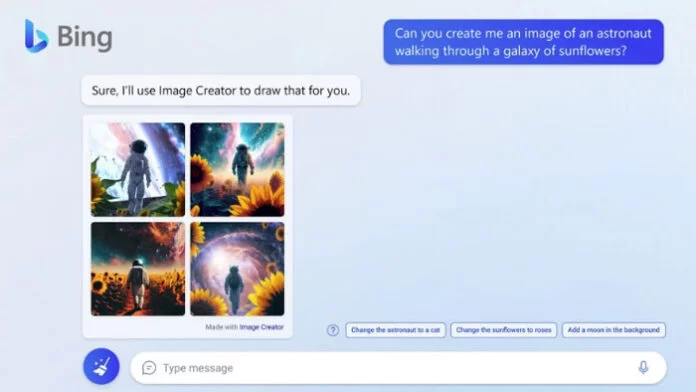 «¿Puedes crear una imagen de un astronauta caminando por una galaxia de girasoles?», le pregunta un usuario a Image Creator, en el ejemplo que proporciona la compañía.