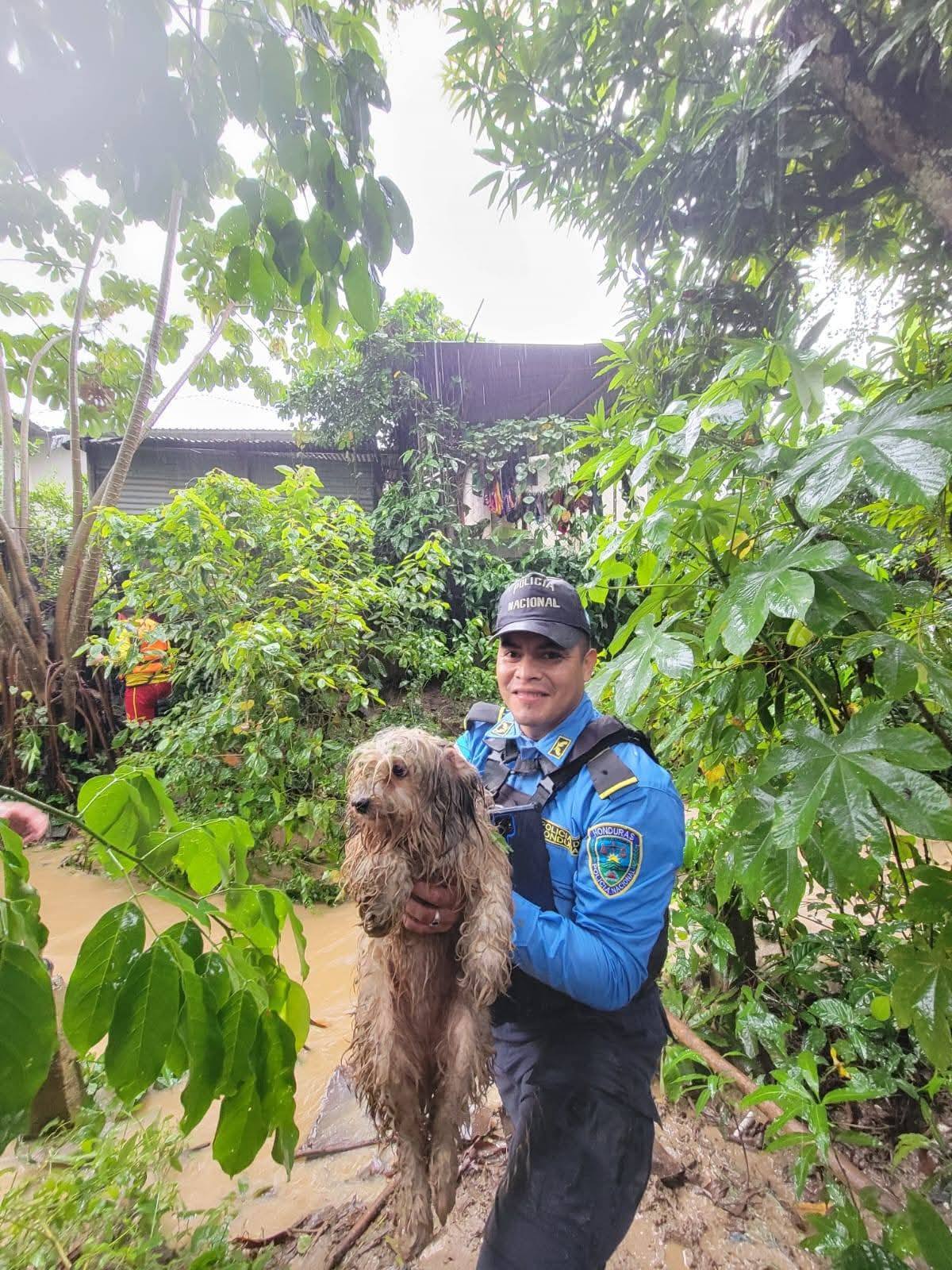 En medio de las fuertes lluvias que golpean la zona norte de Honduras, elementos de la Policía Nacional realizaron un noble acto al rescatar a dos perritos que estaban a punto de ser arrastrados por las corrientes de agua en el municipio de El Progreso, Yoro.