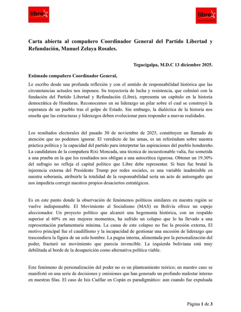 Tomé inicia reconociendo la “trayectoria de lucha y resistencia” de Zelaya, así como su papel en la fundación de Libre, pero señala que la evolución histórica exige cambios y nuevas formas de conducción. “Las estructuras y los liderazgos deben evolucionar para responder a nuevas realidades”, escribió.