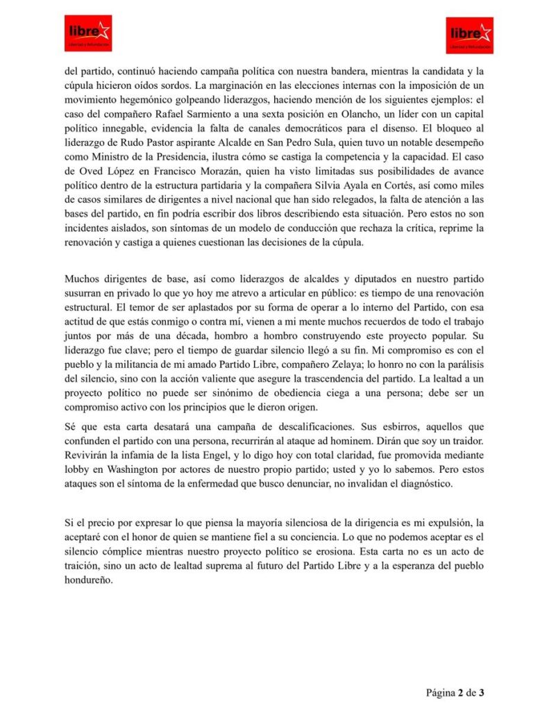 El dirigente concluye su carta con un llamado directo a Zelaya: “Es la hora de los nuevos liderazgos. Es la hora de que la militancia y la dirigencia se levanten, no contra un hombre, sino contra la inercia que nos conduce al abismo”.