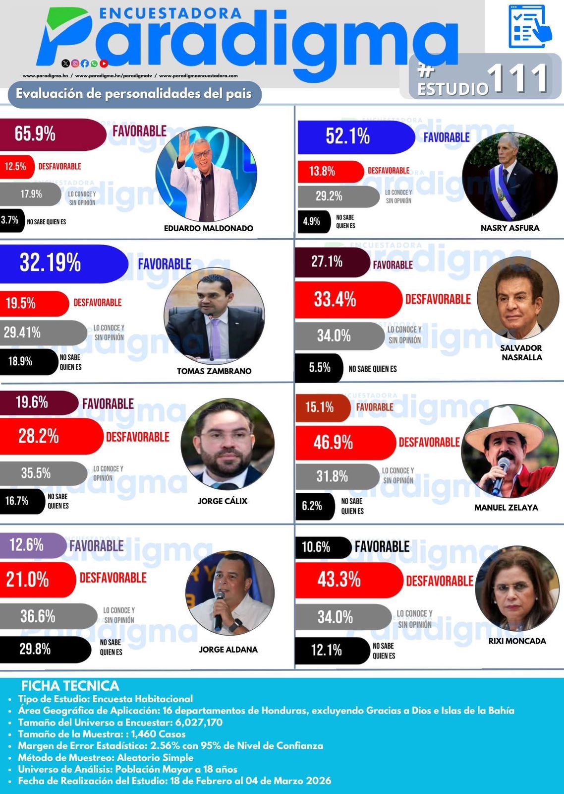 Según el Estudio #111 de la encuestadora Paradigma, Eduardo Maldonado lidera con 65.9%, seguido de Nasry Asfura con 52.1% y Tomás Zambrano con 32.1% en evaluación de personalidades del país