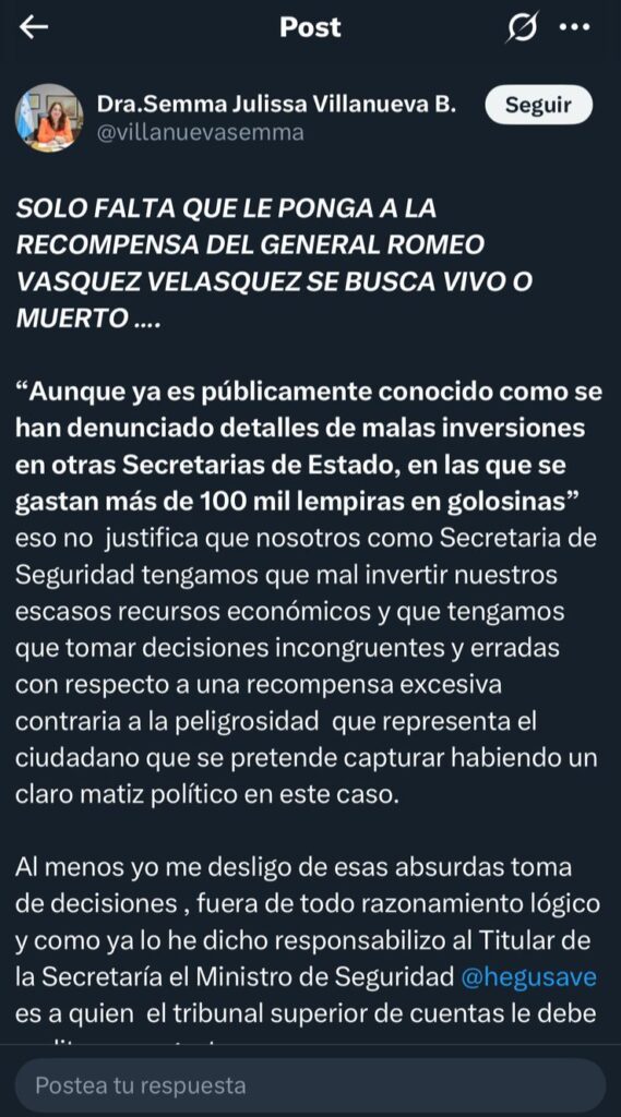 «Por lo menos yo me deslindo de esas decisiones absurdas, carentes de lógica y razonamiento. Como ya lo he manifestado, responsabilizo directamente al titular de la Secretaría de Seguridad, el ministro Gustavo Sánchez. Es a él a quien el Tribunal Superior de Cuentas debe auditar esos gastos», escribió, marcando una clara distancia.